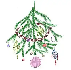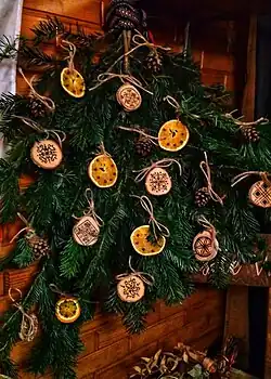 The tradition of hanging a podłaźniczka dates back to an ancient Slavic custom of suspending a decorated branch of fir, spruce, or pine from the ceiling rafters, during the time of the Koliada winter festival.[1] The custom of podłaźniczka is also connected to a later folk tradition of the połaźnik. The połaźnik was the first guest to visit a house on Christmas Eve, often bringing with them a decorated evergreen branch. This custom also existed in Slovakia and Bulgaria; in Lemko tradition, the didok was brought instead.[2] In Serbia, such a branch was called šumka od položenjca (Serbian Cyrillic: шумка од положења), or polaznikova šumka (Serbian Cyrillic: полазникова шумка).[3]