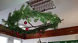 In Poland, the podłaźniczka was known mainly in the regions of Lesser Poland (particularly in the Goral lands[4]) and Upper Silesia. The podłaźniczka was made in various ways, it could be a conifer tree branch,[5] a conifer tree treetop turned upside down,[6][7] or a riddle (przetak) ring to which evergreen twigs were attached.[7] The podłaźniczka was attached to a ceiling rafter,[5] often directly above the Christmas Eve dinner table,[5] or in a sacred corner.[6] Podłaźniczka is considered to be the prototype of modern Christmas tree in Poland.[8]