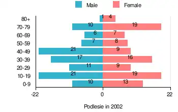According to the 2002 Poland census, there were 208 people residing in Podlesie village, of whom 50% were male and 50% were female. In the village, the population was spread out, with 25% under the age of 18, 39.9% from 18 to 44, 13.9% from 45 to 64, and 21.2% who were 65 years of age or older.[1]