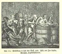 The last case where this punishment is alleged, by some, to have been meted out was in 1734, somewhere in Saxony.[39] Another tradition, however, is evidenced from the Saxonian city Zittau, where the last case is alleged to have happened in 1749. In at least one case in Zittau, in 1712, a non-venomous colubrid snake was used. The Zittau ritual was to put the victims in a black sack, and keep it under water for no less than six hours. In the meantime, the choir girls in town had the duty of singing the Psalm composed by Martin Luther, "Aus tiefer Not schrei ich zu dir" (From deep affliction I cry out to you).[40] The punishment of the sack was expressly abolished in Saxony by a rescript dated 17 June 1761.[41]