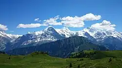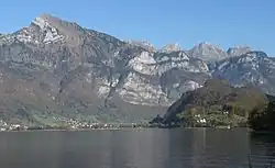 The jump was made from Hinterrugg Mountain, the highest peak in the Churfirsten range (on the right).