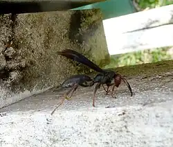 Polistes erythrocephalus is a species of paper wasp in the subfamily Polistinae of family Vespidae found in Central and South America. P. erythrocephalus is a eusocial wasp, meaning that it possesses both reproductive and non-reproductive castes.[3][4] The cooperation between the two castes to raise young demonstrates the altruistic nature of these wasps.[5] P. erythrocephalus exhibits a four-stage colony cycle, as do many other Polistes wasps. This species generally feeds on larvae, occasionally their own, and is preyed upon by species such as army ants.