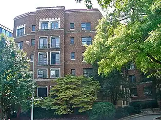 The Ponce de Leon Apartment Building is a historic structure located in the North Cleveland Park neighborhood in the Northwest Quadrant of Washington, D.C. David L. Stern designed the structure in a combination of the Mission Revival and the Spanish Revival styles. The building was completed in 1928. It is an example of 1920s exoticism in a prominent apartment corridor in the city.[2] The exterior features diapered brickwork, terra cotta tile roof, limestone portico and trim, and Moorish arch motifs. The interior features an intact lobby with a decorative plaster ceiling and a terrazzo floor. It was listed on the National Register of Historic Places in 1994.