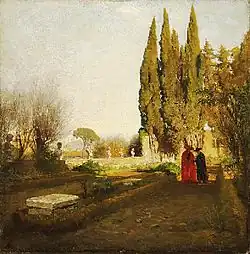 His successors, Clement XIII (1758–1769) and Clement XIV (1769–1774), also routinely went up to Castel Gandolfo.[24][25] Clement XIV in particular loved to gallop on horseback through the woods free of his escort and retinue, a passion he had to give up in 1770 after two falls from his horse in the valley separating Villa Cybo from Villa Barberini.[26] In 1773 he concluded the purchase of the three hectares of villa Cybo, the property adjacent to the Pontifical Villa, by paying 18,000 scudi to the duke of Bracciano Livio Odescalchi.[26][27] The latter had in turn bought the villa from the heirs of Camillo Cybo-Malaspina,[26] the first governor of Castel Gandolfo as Butler of the Sacred Palaces, who had died in 1743.