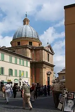 The Piazza Pia in front of it is the largest square in Albano's historic center, opened in the seventeenth century as part of the urban reorganization of the town to create the "trident" of streets. It took its current name in 1847, in memory of Pope Pius IX's visit to Albano the previous year: the name of the square has since undergone a series of ups and downs, which have not, however, changed its popularly recognized name.[67] The square has been the scene of several visits by popes since that of Pius IX: from the gate of the Pontifical Villas overlooking the square, which is permanently guarded by the police, Paul VI in 1963,[68] John Paul II in 1982[69] and Benedict XVI in 2008 have in fact left.[70]