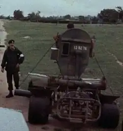 The Pookie was a small one-person vehicle named after the bush baby, and fitted with large Formula One tires bought second hand after the South African Grand Prix. The wide tyres prevented the detonation of buried mines by exerting less ground pressure than a human footprint and spanning the mines' circumference.[1] The vehicle was made with readily available parts from the Volkswagen Kombi and resembled a small go-cart with an elevated cab to protect the driver.[1] The bottom of the cab had a V-shaped reinforced hull to deflect the blast away from the operator. Sensor 'pans', resembling rectangular wings, were lowered and used parallel to the ground below the cab. When the vehicle was transported, the pans were raised at a 45-degree angle.