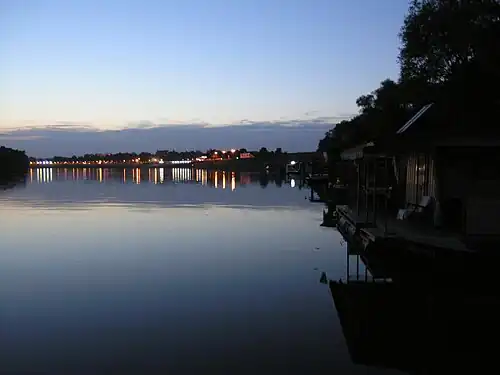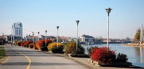The Sava river in Slavonski Brod, a city in Croatia, with a population of 61,823 in 2001. The city was known as Marsonia in the Roman Empire, and as Brod na Savi 12441934. Located in the region of Slavonia, it is the centre of Brodsko-Posavska county, and a river port on the Sava river. It is 197 km southeast of Zagreb and at an elevation of 96 m.