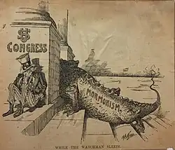 During the rest of the 1870s and continuing during the 1880s, most of the comics relating to Mormonism had ties to politics. One example depicts the many difficulties that the newly elected President Grover Cleveland would face during his presidency in the comic from Puck entitled "Foes in His Path.-The Herculean Task Before Our Next President." These problems were illustrated and the typical personification of Mormonism, which included an old bearded man with the word Mormonism written around his waist and some depiction of his many wives, was shown among them.[1]: 117