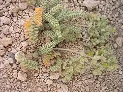 There are two varieties of this plant. The var. rhypara grows on barren tuff and var. shellyi grows in rock cracks and crevices on pumice and tuff.[2] When the plants grow in rock fissures they sometimes appear to be lined up in rows.[5] Associated plants include Purshia tridentata, Poa sandbergii,[2] Gilia congesta, Sitanion hystrix, Scutellaria nana, and Eriophyllum lanatum.[4]