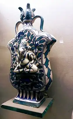 Pottery was something used by everyone and was one of the most prolific crafts in 19th-century India. This was a time when European influence was affecting Indian pottery, which had until then evolved in accordance with locally available raw materials, regional craftsmanship, and community needs. Thus, India and its regions had traditionally harboured several styles such as kagazi or thin-walled slip pottery from Patan and Bahwalpur, Bidri art or smoked and burnished black ceramics with silver inlay from Bengal and Azamgarh, the red and white Kutch pottery are held in the museum collection.[6] The collection represents Rajasthan as well as India to the west.[7] Although, it was generally assumed that India was skilled in production of unglazed pottery, coloured slipware, burnished surfaces, and in previous glazed pottery had also been developed by Indian craftsmen. The glazed earthenware ranging from domestic vessels to tiles, architectural elements and decorative objects are displayed. The collection evidences that Indian craftsmanship illustrated artistic terracotta tiles from temples of Gaur, Pandua and Bengal to Islamic calligraphy and geometric patterns Multan, Peshawar, and Sindh. The collection includes works of the Madras, Bombay, and Jaipur schools. In the process of supplying samples to the museum for exhibition, they developed new techniques.[6]