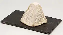 The cheese is distinctive, being pyramidal in shape and golden brown in colour with speckles of grey-blue mould, and is often known by the nicknames "Eiffel Tower" or "Pyramid". It has a square base 6.5 cm wide, is around 9 cm high, and weighs 250 grams (8.8 oz).[1] The central pâte is bright white with a smooth, crumbly texture that mixes an initial sour taste with salty and sweet overtones. The exterior has a musty odour reminiscent of hay.