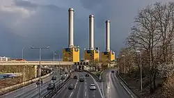 It has three blocks with a power of 110 megawatts, each equipped with a 102-metre-high (335 ft) chimney. This very striking facility received an architectural prize in the 1980s. It is not located near a river and therefore must take its cooling water from underground. There was an explosion on January 2, 1992, in one of the blocks. It is run by Vattenfall Europe, a subdivision of Vattenfall.[1]