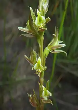 The Shelford leek orchid is only known from a single population growing on a roadside in the Shelford district. It grows in open native grasslands dominated by Themeda triandra in an area subject in the past to extensive clearing for agriculture.[3]