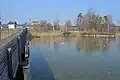 Seedamm and reconstruction of the medieval lake bridge at Rapperswil, Lake Zurich to the left, Obersee to the right, Hurden in the foreground; the area of three pile dwellings and the Neolithic lake crossing.
