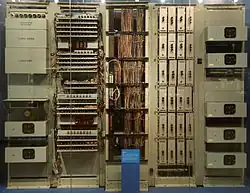 The first ERNIE was built at the Post Office Research Station by a team led by Sidney Broadhurst. The designers were Tommy Flowers[23] and Harry Fensom and it derives from Colossus, one of the world's first digital computers.[24][25] It was introduced in 1957,[2] with the first draw on 1 June, and generated bond numbers from the signal noise created by neon gas discharge tubes. ERNIE 1 is in the collections of the Science Museum in London and was on display between 2008 and 2015.[25]