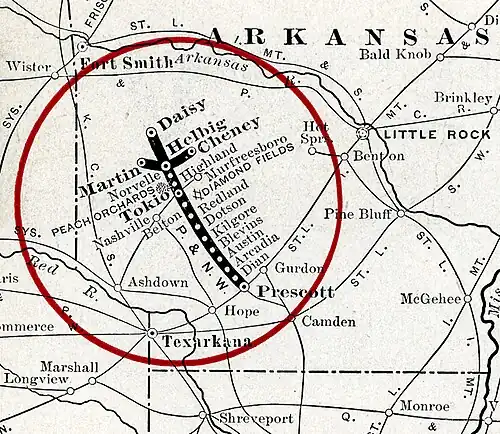 The railroad was chartered in 1890, for the purpose of constructing a railroad north-northwest from Prescott to access timberlands for the Ozan Lumber Company. Track was gradually extended from Prescott to Arcadia, Blevins, McCaskill, Belton, Tokio, and Highland (Pike County), a distance of 31 miles. Early in its history, the railroad operated several logging branches and the line extended beyond Highland to tap lumber stands. The railroad connected at Tokio with the line of the Memphis Dallas and Gulf Railroad which operating between Ashdown, Arkansas and Hot Springs. After 1922, that line became the Murfreesboro -Nashville Southwestern Railroad, operating between Nashville and Murfreesboro until 1951. For many years the unused crossing diamond lay in the weeds next to the mainline of the PNW in Tokio.