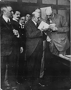The state of emergency, which expired on 31 December 1922, was successively extended until April and then again until 31 December 1923, with only a few votes against in Congress.[39] This measure suspended constitutional guarantees for a specified time period,[40] legitimizing arrests without trial and strengthening the police in relation to the Judiciary.[41] Much of the press was censored.[42] According to the prevailing current in Congress and the Supreme Court, the state of emergency was the middle ground between that of war and full peace and could be used preemptively by any government that felt threatened with overthrow.[43]