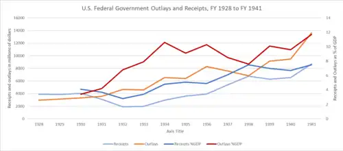 The 1933 Agricultural Adjustment Act created the Agricultural Adjustment Administration (AAA). The act reflected the demands of leaders of major farm organizations, especially the Farm Bureau, and reflected debates among Roosevelt's farm advisers such as Wallace, M.L. Wilson, Rexford Tugwell, and George Peek.[40] The aim of the AAA was to raise prices for commodities through artificial scarcity. The AAA used a system of "domestic allotments", setting the total output of corn, cotton, dairy products, hogs, rice, tobacco, and wheat. The AAA paid land owners subsidies for leaving some of their land idle; funding for the subsidies was provided by a new tax on food processing. The goal was to force up farm prices to the point of "parity," an index based on 1910–1914 prices. To meet 1933 goals, 10 million acres (40,000 km2) of growing cotton was plowed up, bountiful crops were left to rot, and six million piglets were killed and discarded.[41] Farm incomes increased significantly in the first three years of the New Deal, as prices for commodities rose.[42] However, some sharecroppers suffered under the new system, as some landowners pocketed the federal subsidies distributed for keeping lands fallow.[43]