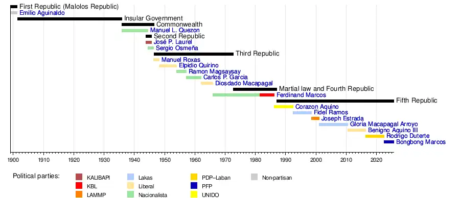 33. ^ Term began when Malvar presumptively assumed the presidency after the declaration of Aguinaldo to the United States.