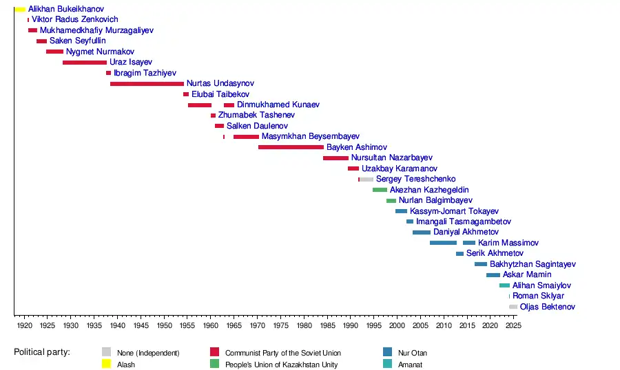 During the Soviet period, the post was formerly known as the chairman of the Council of Ministers of the Kazakh Soviet Socialist Republic prior to its independence in 1991.