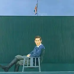 The idea for the portrait was first put forward in September 1979 and Prince Charles met with Bryan Organ in November of the same year.[4] Organ had previously painted a portrait of the subject's aunt, Princess Margaret, in 1970 which had received mixed reviews.[4][5] The portrait of was officially commissioned by the trustees of the National Portrait Gallery in 1980. This was the inaugural work in the Gallery's programme of commissioning portraits and is the first painted portrait of the Prince to enter the National Portrait Gallery.[6] The modern-style portrait depicts Charles in a relaxed pose sat a blue wooden chair and in his polo clothes, including green trousers, knee high black boots and a blue sweatshirt over a white collared shirt.[5][7] The Union Jack can be seen flying at the top behind a green fence.[5][7] In at least one sketch that was done before work on the portrait began, Organ depicts Charles with a slight smile which is missing from the finished painting.[3]