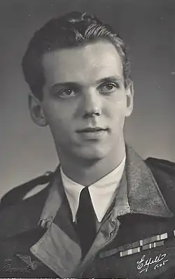 Three years later, at age 17, he joined the U.S. Army with his father's permission, and was commissioned as a lieutenant.[4] Serving in Operation Jedburgh, he was parachuted into Nazi-occupied France as part of a three-man sabotage team (with Maj. Tommy Macpherson and Sgt O. A. Brown) to operate deep behind German lines.[6]