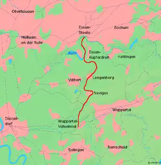 Between Neviges and Vohwinkel the trains had to climb a slope, which at this time could only be climbed with the aid of a zig zag. At the terminal station (German: Kopfstation, literally head station) built in 1847 in the Siebeneick Valley trains had run into the station before reversing on to the other line out of the station. This arrangement was eliminated in 1862 when a new alignment was built, but the whole area still bears the name Kopfstation.