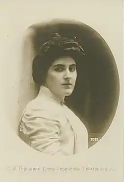 - Elena Georgievna, Duchess of Leuchtenberg, Princess Romanovskaya (3 January 1892 – 6 February 1971). She married on 18 July 1917, in Yalta, Count Stefan Tyszkiewicz (1894–1976, London). He was the son of Count Władysław Tyszkiewicz and Princess Krystyna Maria Lubomirska. By birth, he was a member of powerful and wealthy Tyszkiewicz family, one of few families which belonged to Magnates of Poland and Lithuania.[4]