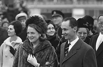 Her father bestowed her with the title Countess of Poblet. During her youth, the Princess was active in society: on 22 April 1955, she was presented as a debutante at a coming out ball hosted by her parents at the Hôtel Ritz Paris.[5] She also attended events such as a reception and party at the Hotel Wellington in Madrid in 1959[6] or the Paris Ball held at the French Embassy in Brussels in 1960.[7]