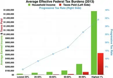 In general, the United States federal income tax is progressive, as rates of tax generally increase as taxable income increases, at least with respect to individuals that earn wage income. As a group, the lowest earning workers, especially those with dependents, pay no income taxes and may actually receive a small subsidy from the federal government (from child credits and the Earned Income Tax Credit).[1]