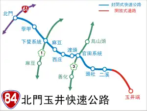 Provincial Highway 84 (Chinese: 台84線) is an expressway, which begins in Beimen, Tainan on the Provincial Highway No. 61 and ends in Yujing, Tainan on Zhongshan Road (Provincial Highway No. 20).
