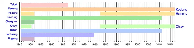 | 1945-10 | Changhua, Chiayi, Hsinchu, Kaohsiung, Keelung, Pingtung, Taichung, Tainan, Taipei[4] |