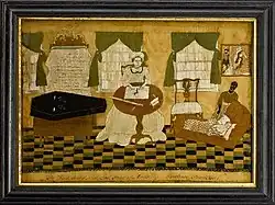 Rossiter produced a number of needlework pictures, including twelve depictions of the twelve apostles inspired by print sources. She is best known, however, for the self-portrait The First, Second, and Last Scene of Morality, completed around 1775. This work portrays a young woman, the artist herself, seated at a table in a finely-furnished parlor. To one side is a baby in a cradle, being cared for by a black servant. To the other is a coffin, marked "PP", sitting on a table.[3]
