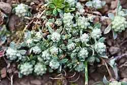 This is a small annual herb producing several stems a few centimeters long which are coated in thin to thick woolly fibers. The leaves are lance-shaped to oblong and under 2 centimeters in length. The inflorescence is a spherical flower head no more than half a centimeter wide. It is a cluster of several tiny woolly disc flowers surrounded by leaflike bracts but no phyllaries. Each tiny flower is covered in a scale which is densely woolly with long white fibers, making the developing head appear cottony.