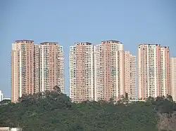 Kwai Hing Estate (Chinese: 葵興邨) was built in the valley of Gin Drinkers Bay,[24] later the town centre of Kwai Chung. Kwai Hing station is named after the name of the estate. It comprises 4 buildings with a total of 400 rental units (TPS units excluded) and 1 shopping arcade. Before redevelopment, it consisted of 5 buildings which were completed between 1970 and 1972. In 1985, the HKHA announced that the strength of the concrete in blocks 3, 4 and 5 of Kwai Hing Estate were below standard.[25] All the blocks were later demolished between 1988 and 1992 to cope with the estate redevelopment.[22] The estate was later redeveloped with 5 buildings between 1991 and 1992.