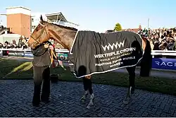 Punjabi’s first notable win came in February 2007 at Kempton Park Racecourse in Surrey, England where he won the Adonis Juvenile Novices' Hurdle, a Grade 2 National Hunt race.[1] However, it wasn’t until 2008 when Punjabi started to make a name for himself, when he became the first horse to legitimately contend for the WBX sponsored Triple Crown of Hurdling. The Triple Crown of Hurdling awards a £1,000,000 bonus to the horse that wins the Fighting Fifth Hurdle at Newcastle, the Christmas Hurdle at Kempton Park and the Champion Hurdle at Cheltenham in Gloucestershire, England in the same racing season.[2] Entering the 2008-2009 racing season, those involved with Punjabi believed their horse was a contender to win the Triple Crown of Hurdling.[3] In early December 2008, jockey Barry Geraghty and Punjabi narrowly beat out Sublimity to win the Fighting Fifth Hurdle.[4] Later that month, Punjabi was running well but fell two fences from the finish line at the Christmas Hurdle. The race was won by Harchibald.[5] In March 2009, Punjabi held off a late charge by Celestial Halo to win the Champion Hurdle in a dramatic photo finish.[6] After the win at the Champion Hurdle, trainer Nicky Henderson lamented at the fact that the fall in the Christmas Hurdle could have been "the most expensive fall in history."[7]