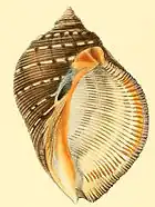 The shell size of Purpura persica varies between 60 mm and 110 mm.[2] It is a large and thick shell, with large body whorl and a very expanded aperture. The surface shows a chocolate-brown color and it is sculptured with spiralled, beaded cords.[1]