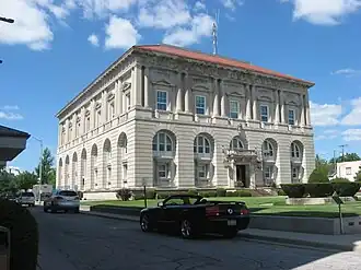 Approximately forty years after the construction of the third courthouse, a movement grew for its replacement by a newer structure. After voters supported the construction of a new courthouse in a 1909 election, the county commissioners selected a Columbus architect,[4] Frank Packard, to design the new building.[2] Packard's design was a large Beaux-Arts structure, built on a stone foundation with stone walls and a tile roof of ceramic;[5] he made extensive use of marble, stained glass, and oak wood. The entire structure cost slightly less than $200,000 to complete.[4]