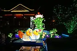 Qinhuai lantern is the traditional art of Jurong City, Jiangsu Province, in China, and part of the national intangible cultural heritage of China. Qinhuai lantern, also known as "Jinling lantern" and "Nanjing lantern", is one of the representative folk arts in Nanjing. The origin of Qinhuai lantern colour can be traced back to the Eastern Wu period, it draws on the traditional Chinese paper tie, painting, calligraphy, paper cutting, shadow puppetry, embroidery, sculpture and other arts, in the production of integrated carpentry, lacquer, painting, carving, clay sculpture, knotting and many other technical means. Qinhuai has a variety of lanterns, reaching from the traditional lanterns to lotus lanterns and lion lanterns. The variety and design of lantern works represents also current events to the time of design, such as ocean-going ships, carrier rockets, urban construction, mountain and forest landscapes.[1]