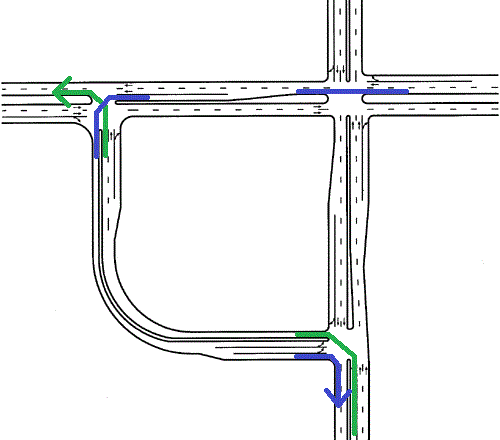 Left-turning traffic is directed away from the main intersection, as exemplified by green and blue traffic: Green traffic arrives from the south and wants to turn left/west. Blue traffic arrives from the east and want to turn left/south. Left-turning traffic from the remaining two directions not shown for clarity.