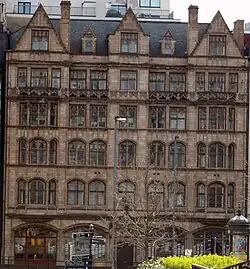 The college started life in Temple Row and Brittle Street (now obliterated by Snow Hill station).[3] From the date of its Royal Charter in 1843 a large Gothic Revival building (Drury & Bateman, 1843–5) was constructed opposite the Town Hall between Paradise Street (the main entrance) and Swallow Street, where a chapel was built to St James.[2] The building had large lecture theatre, laboratories, anatomical rooms, a dining hall and apartments for seventy students.