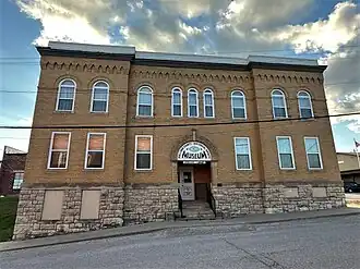 Quincy, Omaha and Kansas City Railroad Office Building, also known as the O.K. Building and Sullivan County Courthouse, is a historic office building located at Milan, Sullivan County, Missouri. It was built in 1898 by the Quincy, Omaha and Kansas City Railroad. It is a two-story, rectangular brick building on a limestone foundation. It features a Romanesque style round arched entrance and second-story window openings. From 1908 to 1940, the building was used by Sullivan County as a courthouse and served as the seat of government for the county.[2]: 5, 16