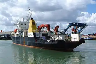 RRS Discovery (III) was built in Aberdeen in 1962 and named after Robert Falcon Scott's 1901 ship, RRS Discovery. Until 2006, she was the largest general purpose oceanographic research vessel in use in the United Kingdom. Measuring 90 metres in length, and fitted with a broad range of oceanographic equipment, Discovery could also accommodate containerized laboratories. She had berths for 28 scientific staff, and the ability to spend up to 45 days at sea.[3] Her last major overhaul was in 1991,[4] when a new superstructure and power plant were installed and her hull lengthened by 10 metres.[5]