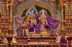 Radha-Krishna Dev has a special place in the Swaminarayan Sampradaya as Swaminarayan himself referred to Radha Krishna in the Shikshapatri he wrote.[77] Further, he himself ordered the construction of temples in which Radha Krishna have been installed as deities. Swaminarayan "explained that Krishna appears in many forms. When he is together with Radha, he is regarded as supreme lord under the name of Radha-Krishna; with Rukmini he is known as Lakshmi-Narayana."[78] The first temple constructed in the sect, built in Ahmedabad in 1822, houses the images of Nara Narayana, forms of Arjuna and Krishna, in the central shrine. The shrine on the left of the hall has murtis of Radha Krishna.[79] According to the philosophy of the tradition there were many female companions of Krishna, gopis, but out of all of them Radha was considered to be the perfect devotee. Those who wish to come close to Krishna must cultivate the devotional qualities of Radha.[80] According to theory the sect has set aside Goloka as the supreme heaven or abode (in fact, in some of their temples, such as the Mumbai Temple, the murtis installed are those of Shri Gaulokvihari and Radhikaji), because there Krishna is supposed to be enjoying himself with his Gopis,[81] who according to the Swaminarayana sampradaya the milkmaids with whom Krishna danced; his relations with them symbolize the relation of God with the devotee in reciprocation.[82]