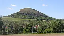 Radobýl (German: Radebeule) is a basalt hill in Central Bohemian Uplands in the Czech Republic. It has an altitude of 399 m (1,309 ft) and is located in the Ústí nad Labem Region, on the border between the territories of Žalhostice and Litoměřice. It rises above village of Žalhostice on right bank of the Elbe River. Part of the hill with abandoned basalt quarry and rich rock steppe flora is under protection as Radobýl Nature Monument. The hill is a popular hiking destination. From huge metallic cross (erected in 1991) on the bare summit there is almost 360-degrees panoramic view of central part of the Central Bohemian Uplands, Litoměřice, Terezín and Lovosice.