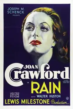 Rain is a 1932 pre-Code drama film that stars Joan Crawford as prostitute Sadie Thompson. Directed by Lewis Milestone and set in the South Seas, the production was filmed in part at Santa Catalina Island and what became Crystal Cove State Park in California. The film also features Walter Huston in the role of a conflicted missionary who insists that Sadie end her evil ways, but whose own moral standards and self-righteous behavior steadily decay. Crawford was loaned out by MGM to United Artists for this film.