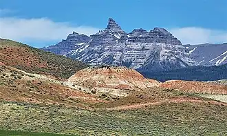 The peak is situated approximately 16 miles east of the Continental Divide in the Absaroka Range. It is set in the Washakie Wilderness, on land managed by Shoshone National Forest. Topographic relief is significant as both the east and west aspects rise 2,000 feet (610 meters) in one-half mile. The nearest town is Dubois, Wyoming, 16 miles to the south-southeast, and the peak is a conspicuous landmark seen from U.S. Route 26 / U.S. 287. The mountain's name has been officially adopted by the United States Board on Geographic Names, and was in use in 1914 when published in an USGS bulletin.[3][4] The first ascent of the summit was made July 13, 1960, by H. & Mrs. Kellogg.[5]
