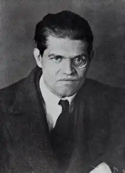 At the same time, Hausmann started to experiment with sound poems he called "phonemes"[12] and "poster poems", originally created by the chance lining up of letters by a printer without Hausmann's direct intervention.[13] Later poems used words which were reversed, chopped up and strung out, then either typed out using a full range of typographical strategies, or performed with boisterous exuberance. Schwitters' Ursonate was directly influenced by a performance of one of Hausmann's poems, "fmsbwtazdu", at an event in Prague in 1921.[14]