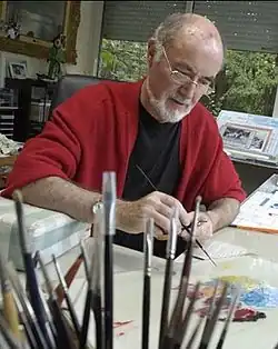 After this injury, Jacques de la Croix could no longer continue studying the classical singing he had practised since his adolescence. His career as a singer halted, he decided to devote himself entirely to painting, helped by his father-in-law, René Robin, and he changed his name to become Raphaël Toussaint. With René Robin, he came into direct contact with the landscape and began his first period. His painting Holidays in Saint Raphaël would determine the profile of what became the definitive expression of his art.[5] René Robin directed him towards naive art, because he felt that his vocation is there thanks to his patience and meticulousness. Until 1970, he worked under the secrecy of anonymity in order to make sure that his choice to devote himself entirely to painting was not an adventure without a future.[6] In 1965, he began his first exhibitions in different galleries and that he was selected the following year to participate in the Salon "Comparaisons" at the Grand Palais (Paris).[7] A few years passed where he affirmed his talent and in 1971 he was appointed Member of the Salon d'Automne. "Be congratulated and thanked, your work is beneficial, it carries within it the true values of life, the quiet and firm certainty that happiness is in simplicity, and not in money which is a lure. To build a work such as yours, in our times of anguish and iron, dear Raphaël Toussaint, is to bring us closer to the angels ... " declares Édouard Georges Mac-Avoy, the president of Salon d'Automne, in 1990.[8]