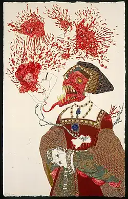 Shaw's paintings suggest a fantastical world full of intricate detail, rich colour and jewel-like surfaces, all masking a collection of intensely violent and sexual images. Fused with an eco-system of vibrantly painted flora and fauna, half human/half animal creatures, with screaming mouths and engorged or bleeding eyes are characters in a dizzying scene of erotic hedonism, both explosive and gruesome in its debauchery.[4]: 10